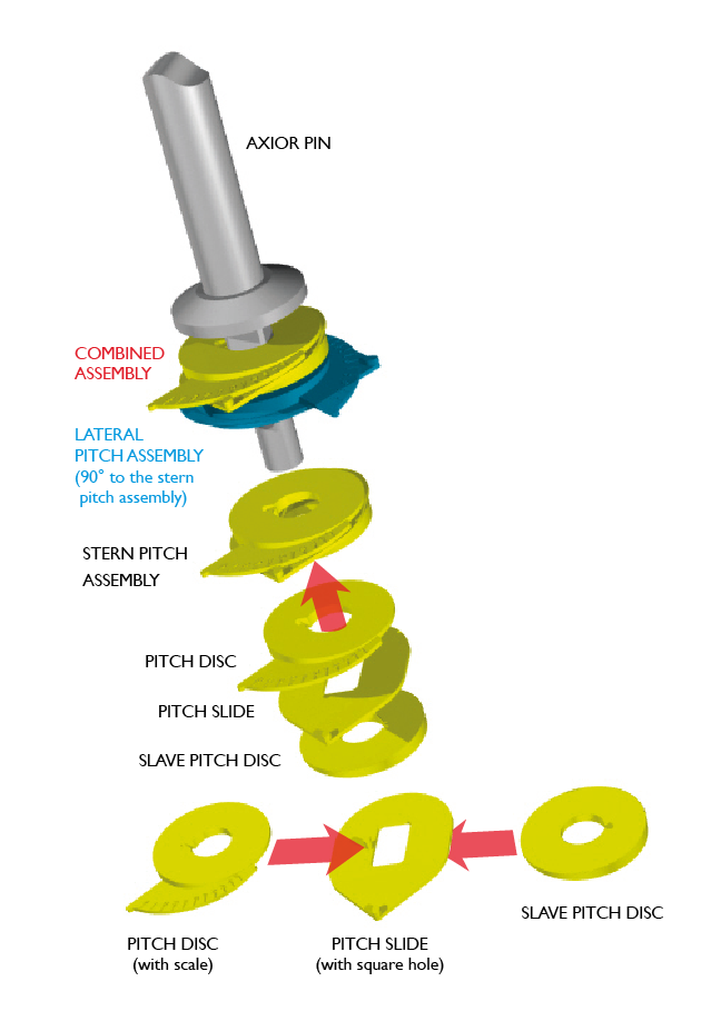 - The pitch components provide precise adjustment on two axes at right angles. By convention we assemble as shown in the illustrations. The Combined Assembly shows a port/stroke–side set–up. The yellow components face astern to control stern pitch, the blue ones face should inboard to control lateral pitch.