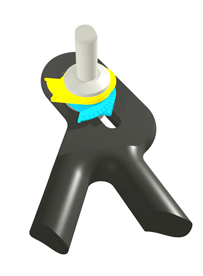 - Now add yellow pitch slide, facing as indicated, sliding its slot over the squared shank and engaging its peg into the notch in the first component.